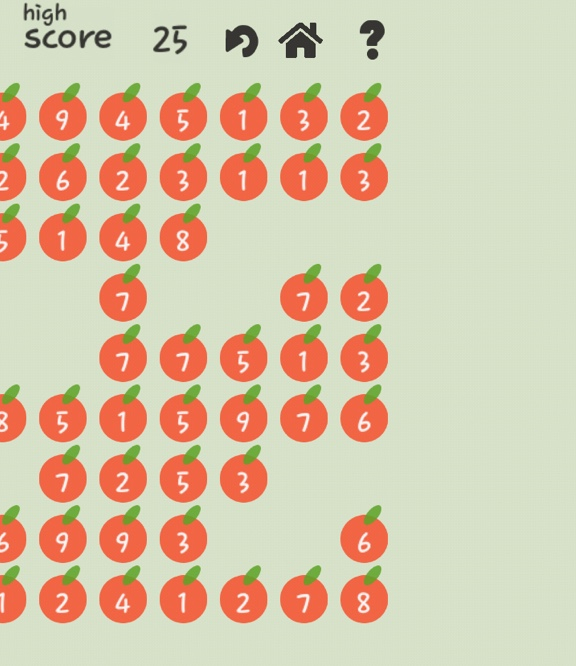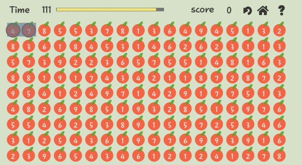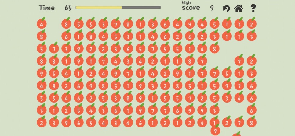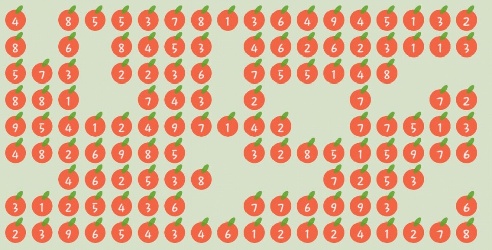 그렇게 사과를 빨리 완성하고 없애다 보면 점점 쉬워질 겁니다. 이유는 사과 수가 적을수록 남은 것은 별로 없기 때문에 어지럽고 숫자도 잘 보이기 때문입니다.