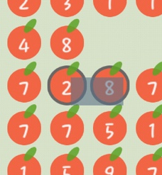 위 사진을 보시면 사과 게임 플레이 중 숫자 2, 8이 적힌 사과를 드래그한 모습을 보실 수 있습니다. 두 개를 드래그하면 사과가 떨어져서 점수가 올라갑니다.