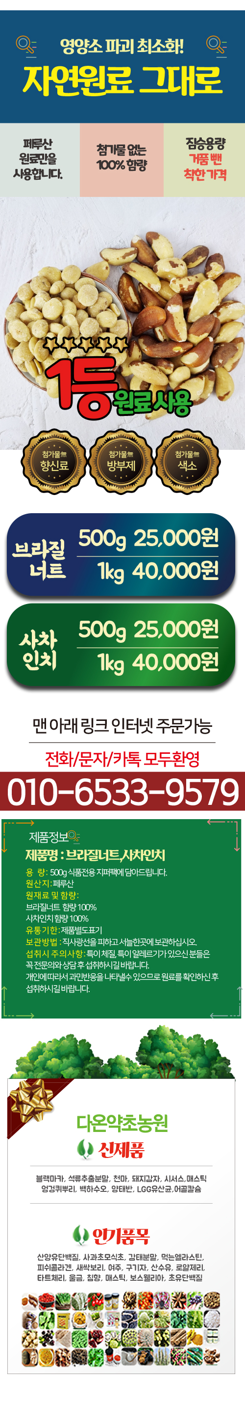 오랜 세월 원주민들의 사랑을 받아온 페루산 브라질너트와 사차인치! 그들만의 전문적인 노하우와 기술력으로 품질도 매우 우수합니다.그 중의 영양소 또한 페루산을 따라잡을 수 없다고 생각을 합니다.