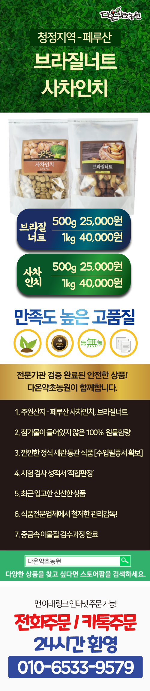 사차인치 효능 중 오메가3와 오메가6, 브라질 견과류 효능 중 높은 셀레늄 함량! 최근 입고된 신선한 영양소로 섭취하세요. 주원산지 페루 자연에서 채취한 리얼 100% 견과류 입니다. 선별 과정을 통해 신선하고 여문 원물만을 취급합니다. 브라질 너트를 먹는 방법, 셀레늄을 먹는 방법도 참고하여 바람직한 섭취를 해 보십시오. 정식 세관 통관 식품! 건강한 견과류! 다옹 여러분들과 함께 해 주세요