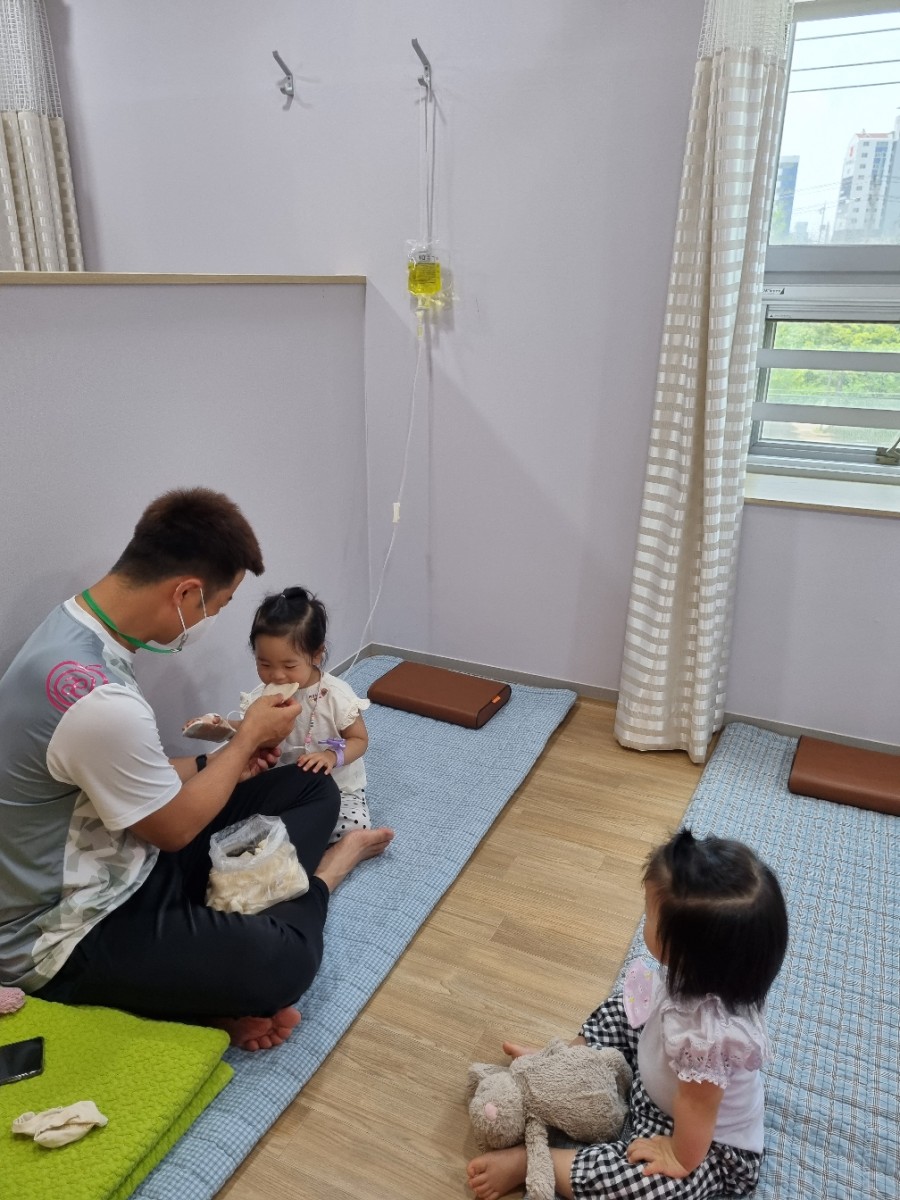 오전 10시 56분 두 아이들 데리고 병원 출동… 열은 내렸지만 계속되는 기침에 피 검사도 하고 수액도 맞고 예리도 같이…