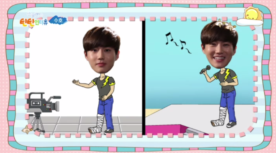 하지만 수호는 위기를 기회로 삼아 더욱 노력했습니다. 춤 연습 대신 연기 연습이나 노래 연습을 두세 배 열심히 해서 데뷔의 꿈을 키워나갔어요. 2012년 봄, 연습의 결실이 맺어져 그룹 엑소의 리더로서 데뷔하게 되었습니다. 데뷔 후 소소하지만 기뻤던 순간은 노래 목록 정리하느라 아티스트 이름에 엑소가 생겼을 때였대요.