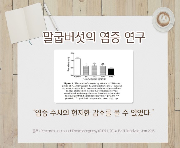 특히 현대의학이 체계를 갖춘 시기에 발표된 항염증 논문을 봐도 말굽버섯을 정상인보다 더 높은 염증 수치를 보인 피험자에게 사용했더니 그 수치가 감소했다고 발표한 결과도 있습니다.