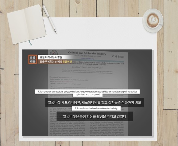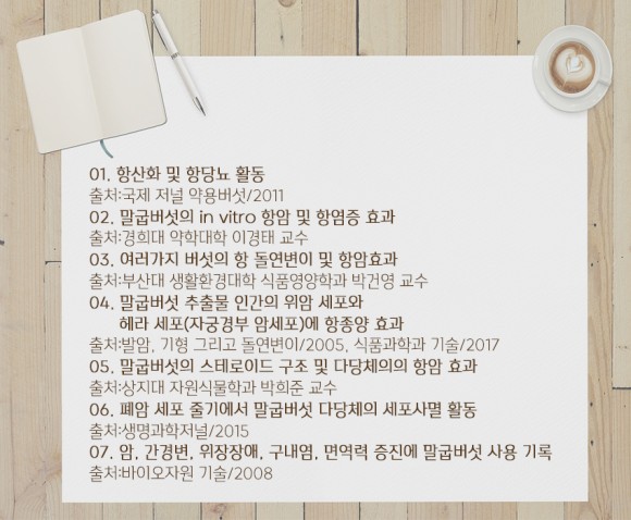 이경태 경희대 교수의 경우 말굽버섯은 그 항암기전과 염증에 대항하는 효과가 탁월하다고 평가해 암을 일으키는 돌연변이 억제 효과가 있다는 부산대의 연구도 확인할 수 있습니다.
