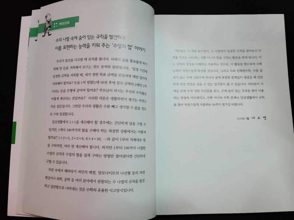 (2) 어떤 규칙에 따라 나열된 수의 열을 수열이라고 하고, 각 수를 수열의 항이라고 합니다.항은 번호를 붙여 나타내며, 항의 개수가 유한개인 수열을 유한수열, 항이 무한히 이어지는 수열을 무한수열이라고 합니다.2교시부터는 저희가 고등학교 때 배우는 과정이기 때문에 간단하게 2교시까지 하겠습니다.가우스를 읽으면서 고등학교 때 이렇게 배웠으면 아직도 많은 사람들이 수염을 잘 알지 않을까 하는 생각이 들었어요.^^