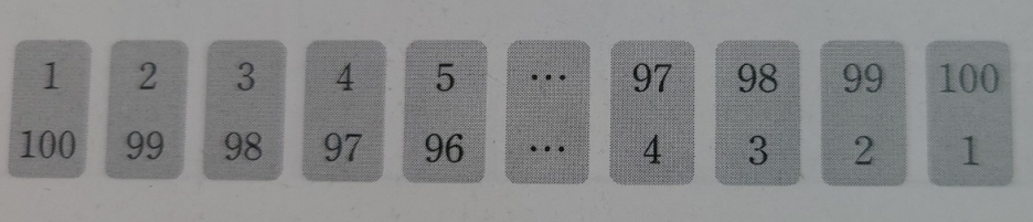 <이제부터 가우스의 첫 번째 수업에 대해 알려드리겠습니다> 1교시에 차례대로 나열된 자연수의 합을 구하는 방법 1) 구하는 자연수를 순서대로 적는다.2) 순서대로 쓴 자연수 아래에 그 순서를 거꾸로 해서 다시 쓰고 위아래 숫자를 사격형으로 조합한다.3) 상하 숫자를 더한 값을 사각형 개수만큼 곱한 뒤 2로 나눈다.