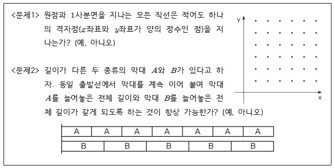 0. 수학적 사고[초등 빈출]1)직관적 사고:관찰, 실측, 제도 등이나 직감을 통해서 곧바로 전체를 감지할 수 있는 사고+)저학년”도형”학습으로 활용 삼다 2)귀납적 사고:몇가지 구체적인 사례==공통 요소 또는 규칙==>일반적인 원리나 법칙을 발견 예)2~3개의 사례=>원의 지름은 반경의 2배야!3)연역적 사고:일반적인 명제, 보편적 원리나 법칙=>특수로 개별적인 명제, 원리, 법칙을 이끌어 내는 예)삼각형의 삼각의 합은 180〫이다.( 대전제)오각형은 삼각형의 3가지로 나뉜다. ( 소전제)=>오각형의 오각의 크기의 합은 540〫이다. (결론)