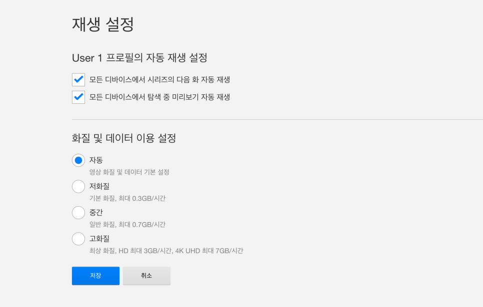 6. 재생 설정 페이지를 확인하면, 화질이나 데이터 이용 설정을 변경할 수 있습니다.재생 설정 페이지의 기본 화질이 자동적으로 설정되어 있으므로 HD 고화질로 변경합니다.(스탠다드 및 프리미엄 요금제는 HD 화질 지원)