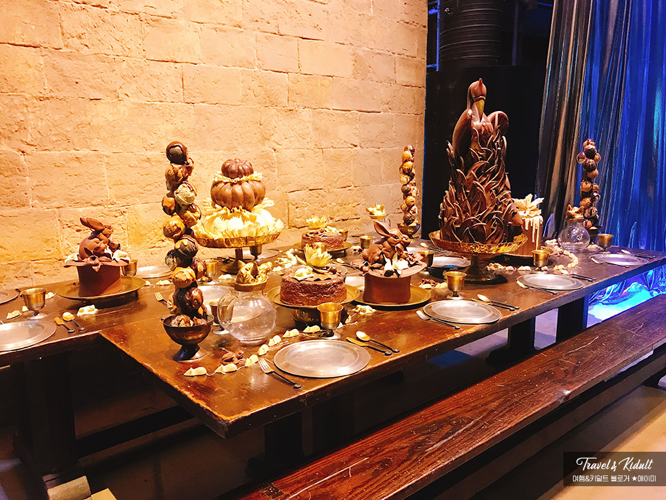 본격적으로 연회장 입장 전에 같은 팀 사람들과 대기 중.여기 들어가기 전에 극장 같은 곳에 앉아서 해리포터 관련 영상을 보고 스태프 설명 후 두근두근하면서 연회장 문 앞에서 문이 열리기를 기다린다 ㅋㅋㅋ 갑자기 해리포터 안으로 들어온 것 같은 느낌이 든다.