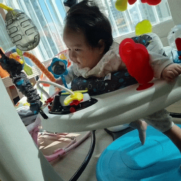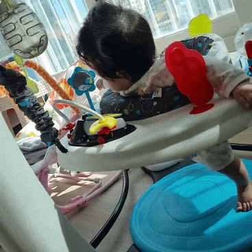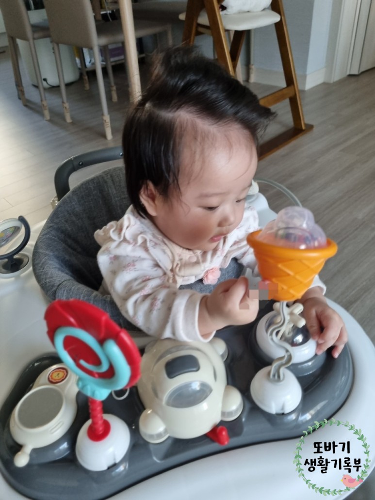 아내가 집안일을 하는 동안 깔때기 때문에 보행기에 올려놓았다.