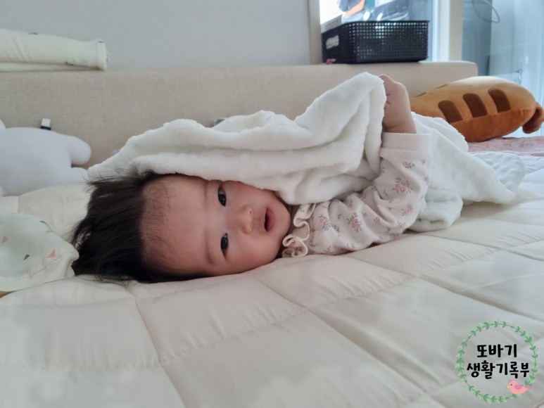 아침부터 이불로 사랑스러움을 뽐내며 아내를 바라보고 있는 시아의 모습이다