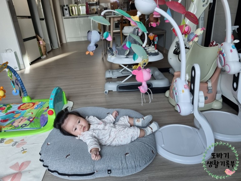오늘도 아내가 집안일을 하는 동안 쿠션에 누워 모빌을 보는 시아지만 벌써 모빌의 유효기간이 지났는지 별 관심을 보이지 않는 시아다.