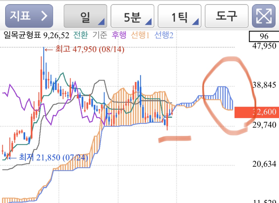 ㅇ 매수 타이밍 : 하락장에서 구름대가 꼬이면 ㅇ 매도 타이밍 : 상승장에서 구름대가 꼬이면 이때 구름대의 굵기가 굵을수록 신뢰도가 높습니다.그럼 구름대를 어떻게 차트를 그려?◆트레이딩뷰 설정