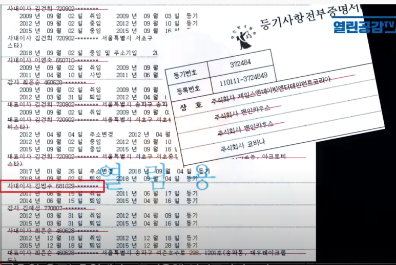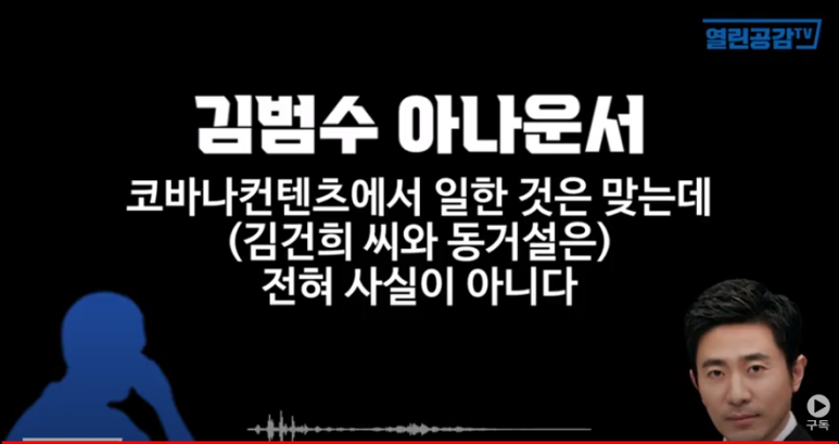 코바나 콘텐츠에 등재된 김범수 사내이사 김범수 아나운서는 이에 대해 부인하고 있지만 정황상 김건희와 김범수의 동거 사실에 대해 여러 증언을 고려할 때 사실일 가능성도 배제할 수 없다. 부모가 알고 있는 상태에서 결혼을 전제로 교제 중 윤석열 중앙지검 과장을 만나 이중 동거했다면 윤석열은 성상납으로 포괄적 뇌물죄를 피할 수 없다는 게 법조계의 시각이다.