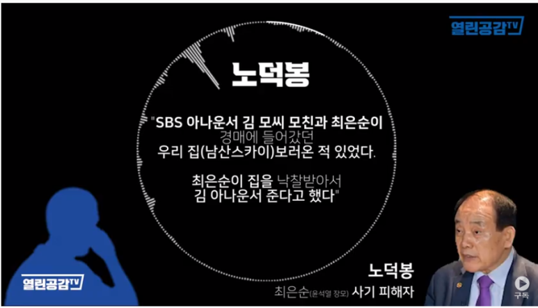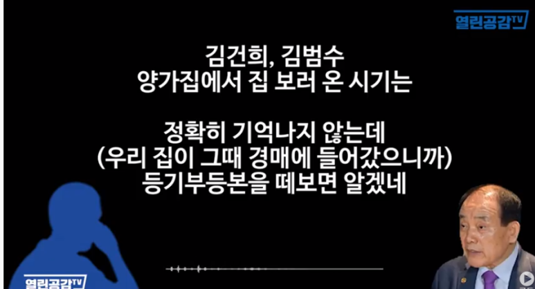 https://youtu.be/DD850JN wbMM12일 열린 공감TV는 윤석열 부인 김건희씨가 청담동 해당화 교실(2011년 5월부터 9월까지)에서 김범수 전 아나운서를 남편으로 소개했다는 제보자의 녹음 파일을 공개했다.