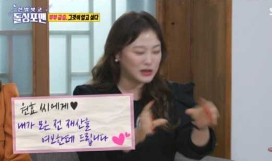 그러면서 남편의 개그맨 김원효(41)에게 1억원을 선물한 일화도 공개하고 김 전효를 만나기 전에 월세도 내지 못했다. 한 번도 통장에 500만원이 찍힌 적이 없었다.다행히 결혼 후 일이 잘 풀렸다”며 “1억원을 딱 모으는 순간 9시가 되자마자 은행에 가서 수표로 인출했다.남편이 좋아하는 차돌이를 구워 일으켰다.내가 이렇게 행복하게 사는 것은 당신 덕분이다.내가 모은 전 재산을 당신에게 드린다는 편지도 썼다고 전했다.