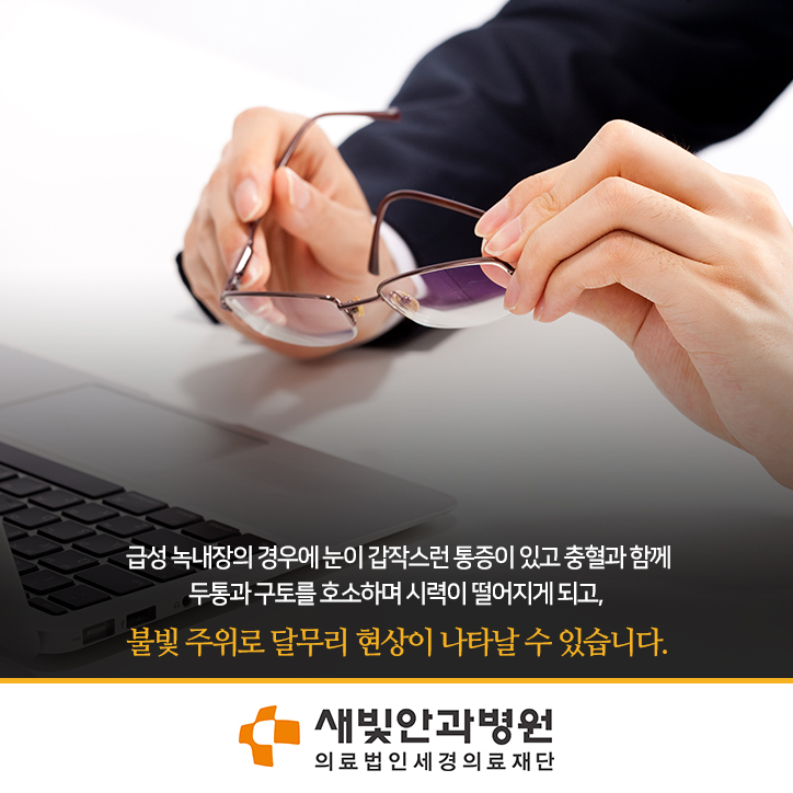 급성 녹내장의 경우 눈이 갑작스런 통증이 있어 충혈과 함께 두통과 구토를 호소하며 시력이 저하되고 불빛 주위에 달무리 현상이 나타날 수 있습니다.