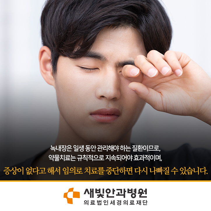 녹내장은 평생 관리해야 하는 질환이므로 약물치료는 규칙적으로 지속돼야 효과적이며 증상이 없다고 임의로 치료를 중단하면 다시 나빠질 수 있습니다.급성 폐쇄각 녹내장의 경우 레이저 수술이나 녹내장 수술 등의 치료가 필요할 수 있습니다.