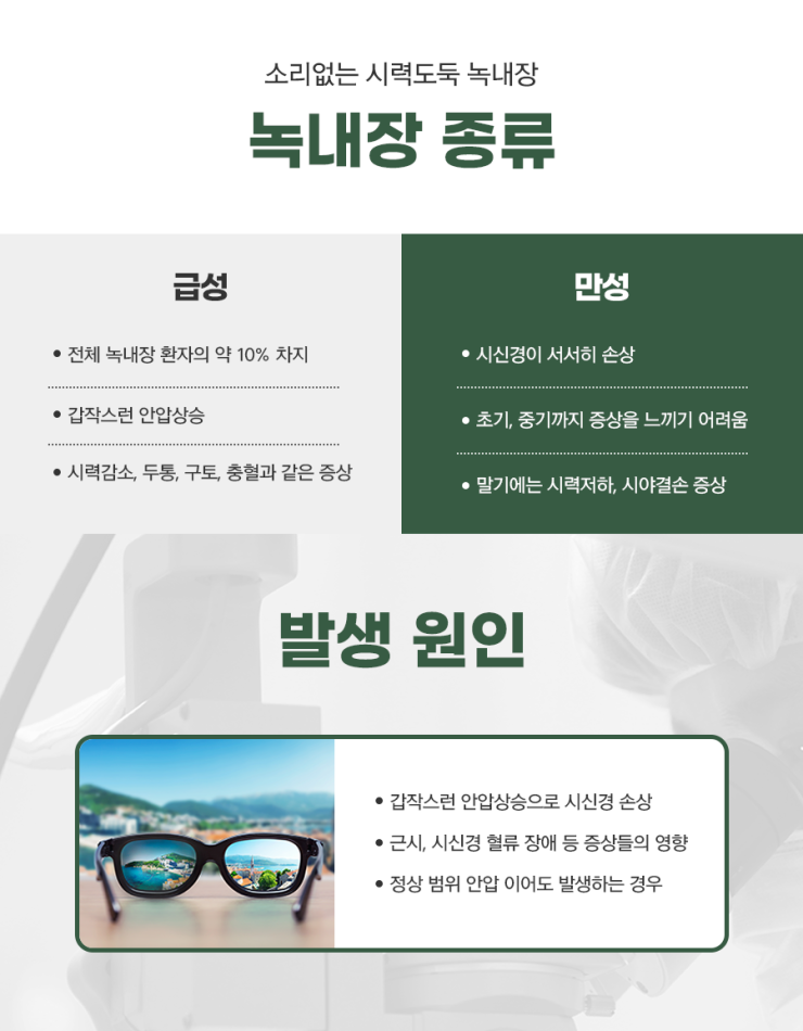 두 가지에 대해 대구 녹내장 수술처를 좀 더 자세히 말씀드리고 싶습니다. 급성형과 만성형으로 나눌 수 있습니다.급성의 경우는 어느 날 갑자기 안구가 붉어지거나 통증을 느끼게 되고 두통과 메스꺼움을 동반하는 등으로 발작을 일으켜 안압이 상승할 수 있습니다. 매우 위험한 상태이기 때문에 방치해서는 안 된다는 것을 알 수 있습니다.
