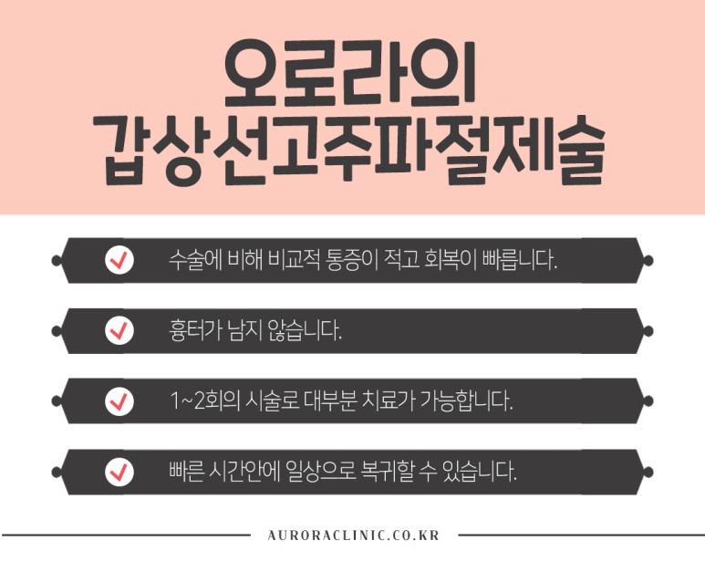 갑상선 고주파 제거술은 일반 수술과 비교해 유사한 치료 효과를 보이며 수술로 인한 부작용을 최소화합니다. 또한, 많은 경험과 노하우로 필요한 부분만 제거하여 주변의 갑상선 조직을 손상시키지 않고 안전하게 유지시킴으로써 안전하게 갑상선 양성결절을 제거하고 있습니다.