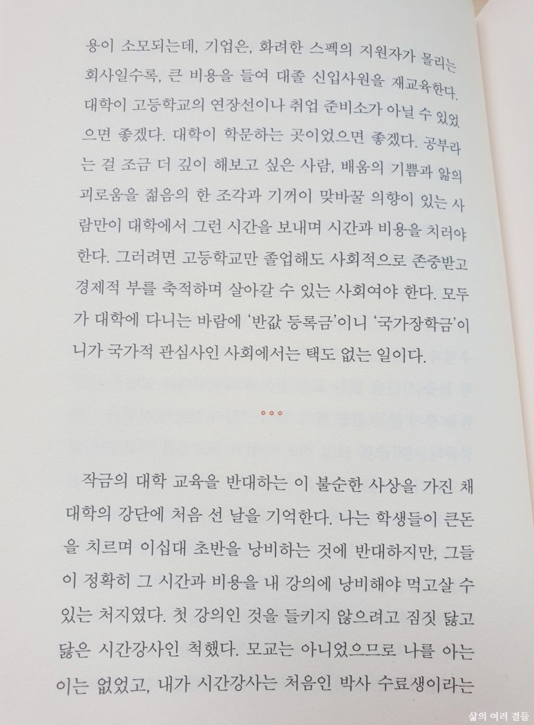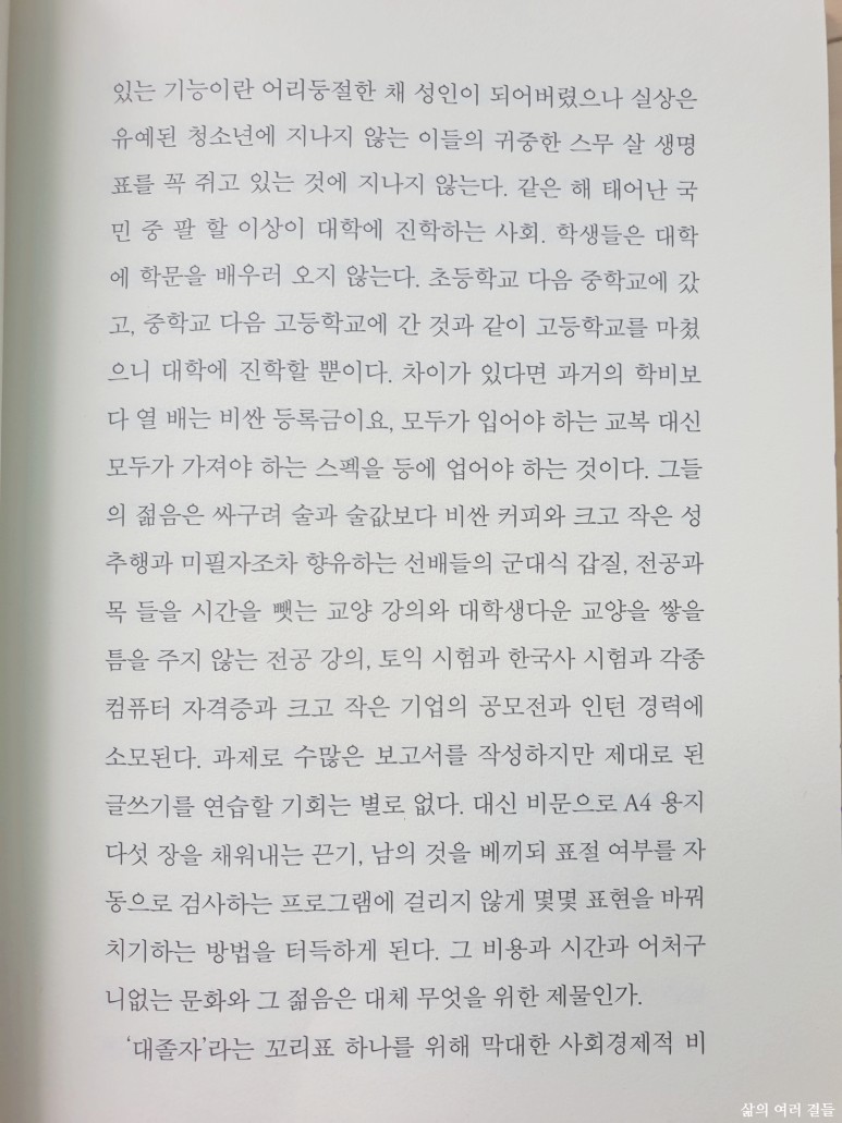 박사 졸업장을 운전면허증에 비유해 박사=연구면허일 뿐이라고 스스로 고백하지만 오랫동안 대학에 몸담아 연구자금 주위를 배회해 본 사람으로서 대학이 어떻게 해야 할지 목소리를 더한다. 저자는 학생들에게 대학이 무엇인가부터 시작해 글쓰기 형식까지 가르쳐야 했다지만, 성인이 돼버렸지만 실상은 유예된 청소년일 뿐인 사람들의 말을 듣자 이들이 어떤 바람직한 대학생의 자세를 가져야 하는지보다는 기성세대가 그들에게 무엇을 줘야 하는지를 더 고민하게 했다.