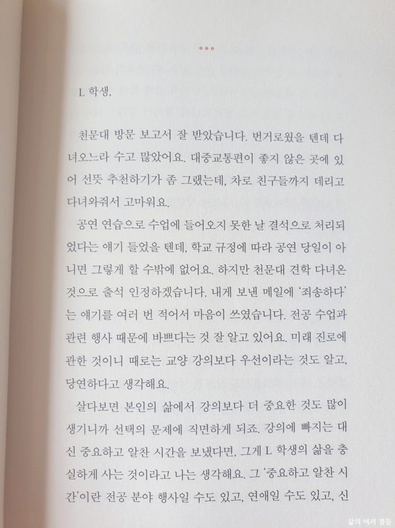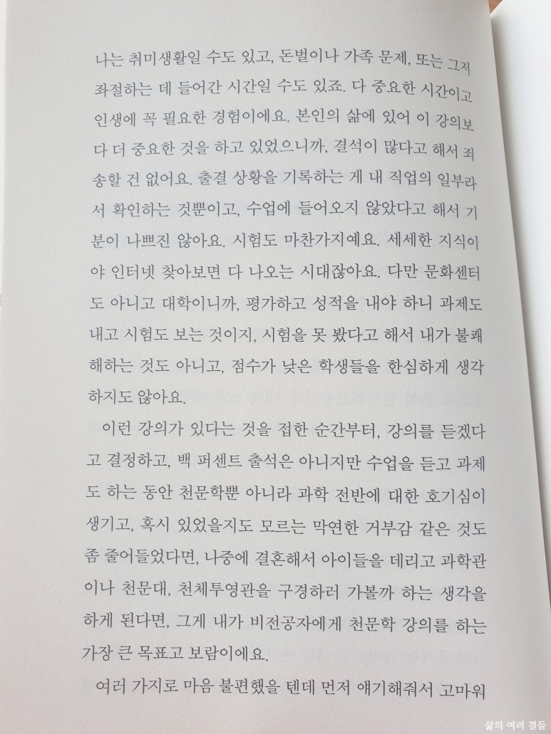 반면 과학이란 많은 시간과 돈이 필요한 것이기 때문에 사회적 합의가 이뤄지지 않으면 성장하기 어렵다. 천재적인 과학자가 어디서 폴짝폴짝 나타날 수 없다는 뜻이다(p.146). 저자는 천문학자가 아니더라도 우주를 사랑할 수 있고 우주를 사랑하려면 수만 가지 방법이 있다고 말했다. 나는 그들이 연구에 매진하고 기술을 개발해 우주탐사를 기꺼이 뒷받침하고 싶다.
