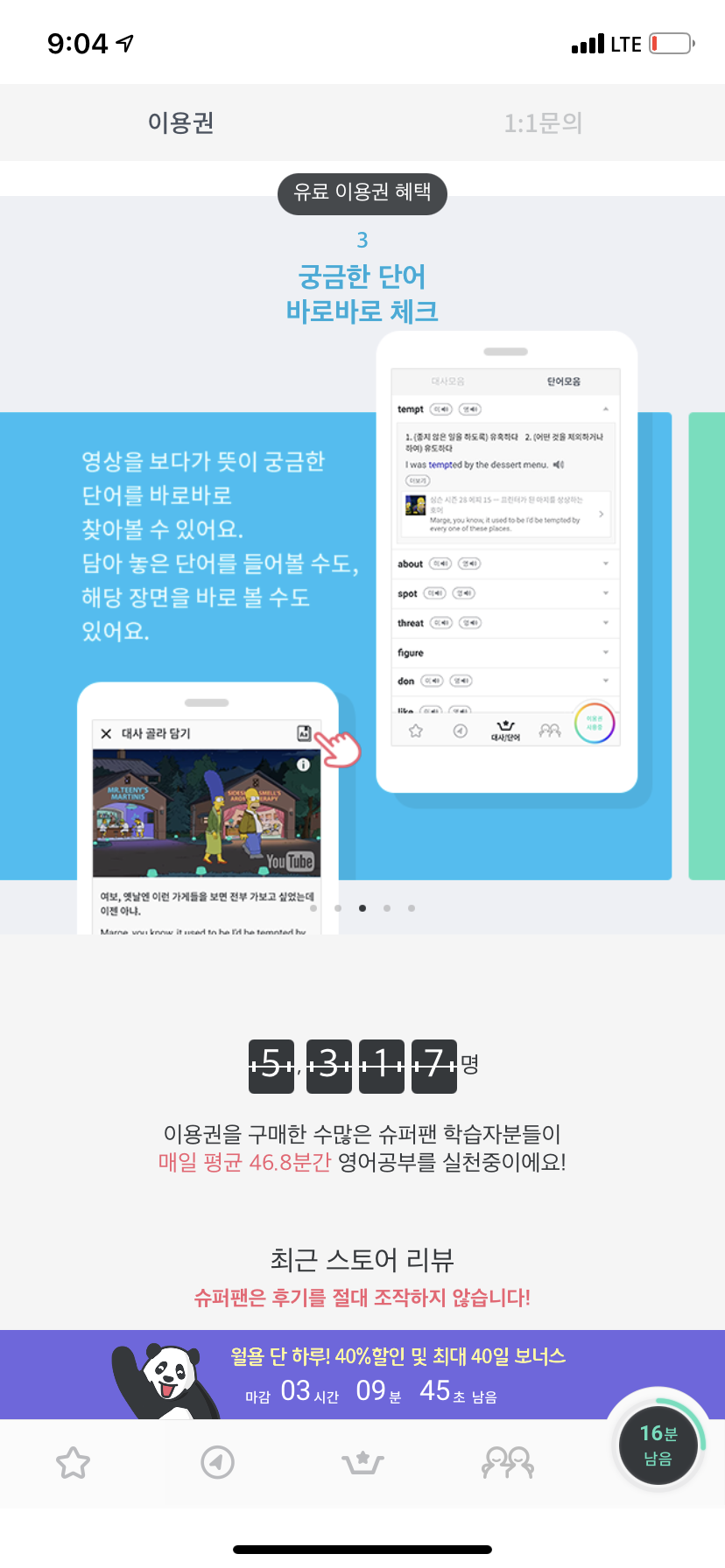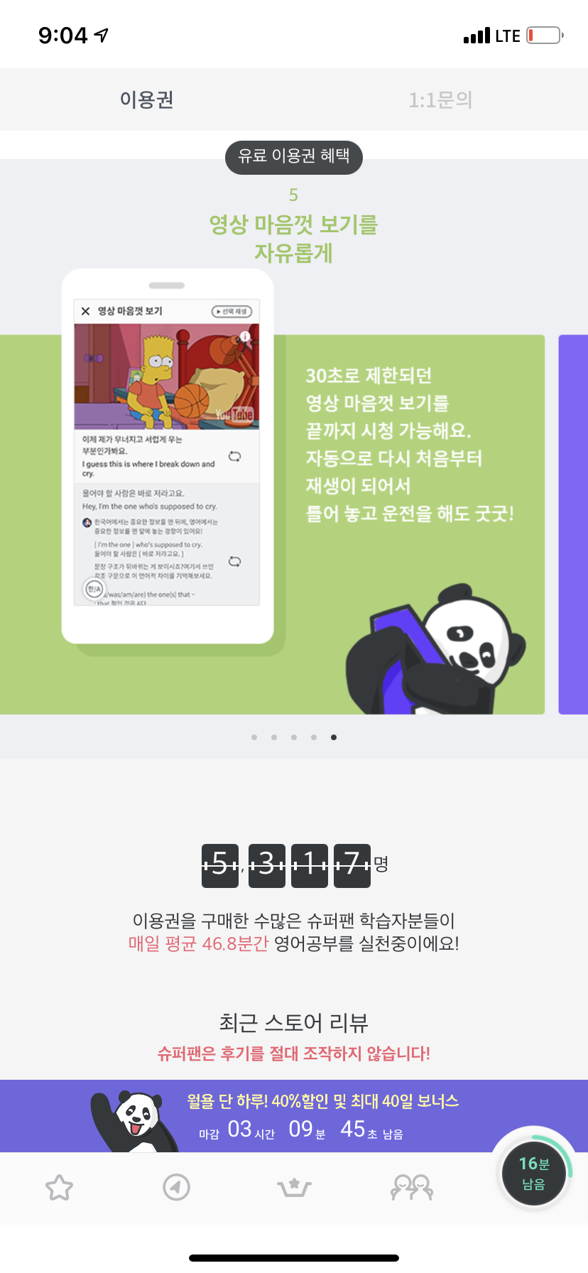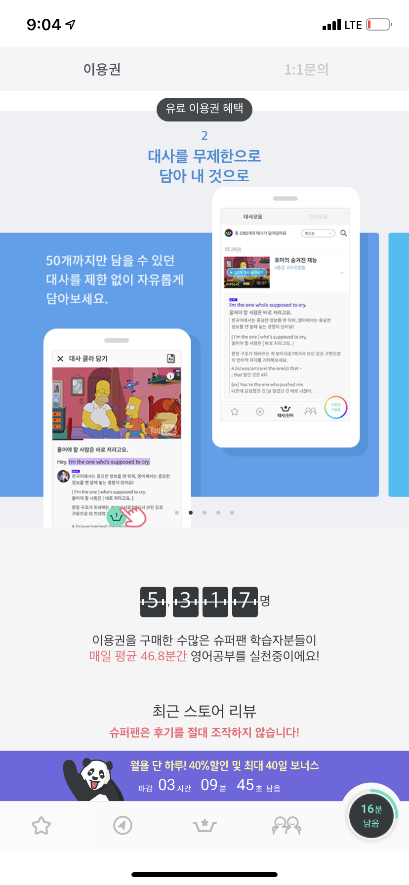 이유 : 여러 자료와 카테고리를 제시하여 관심있는 영상에서 흥미유발 및 영어공부 유도단, 유료 결제인 부분이 아쉽다.. (´;ω;`)