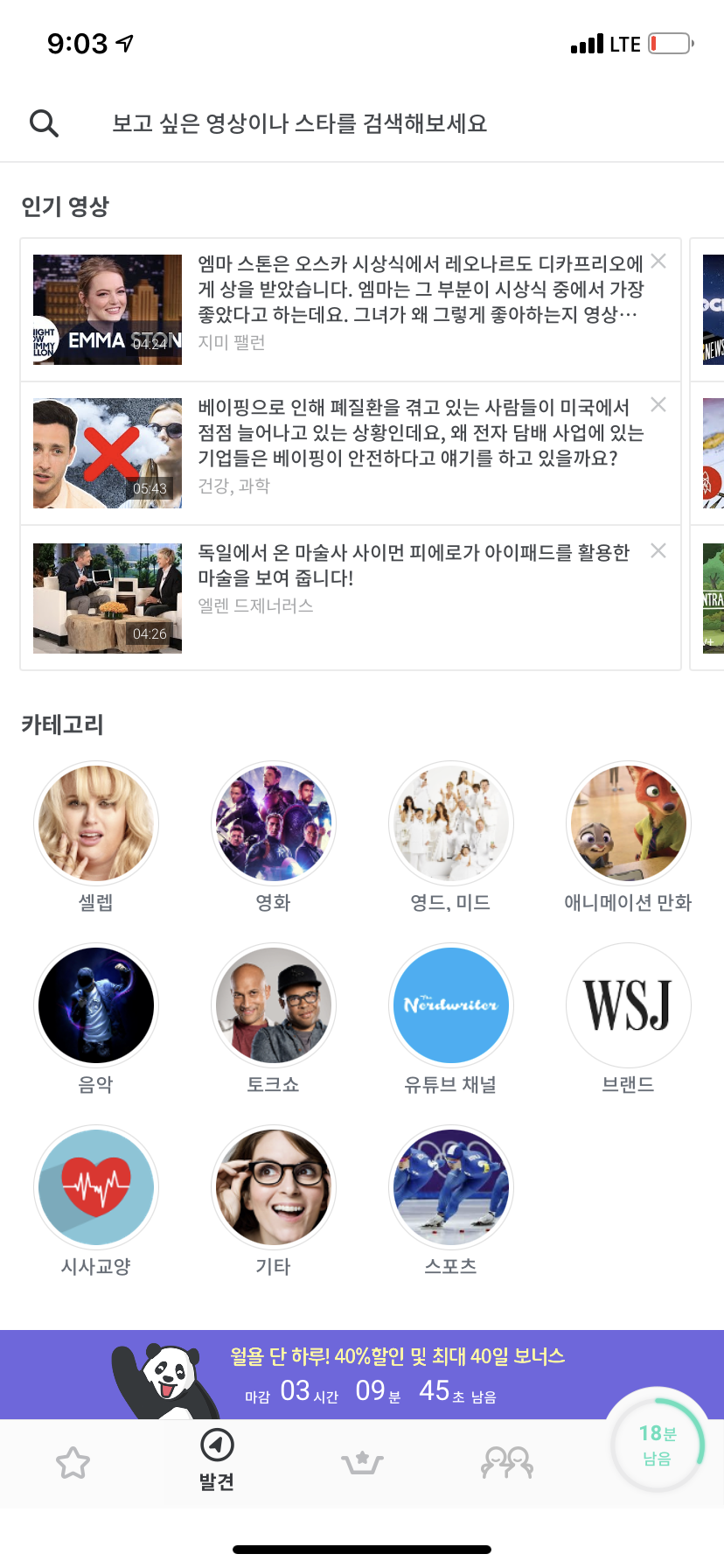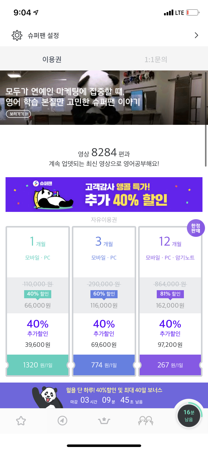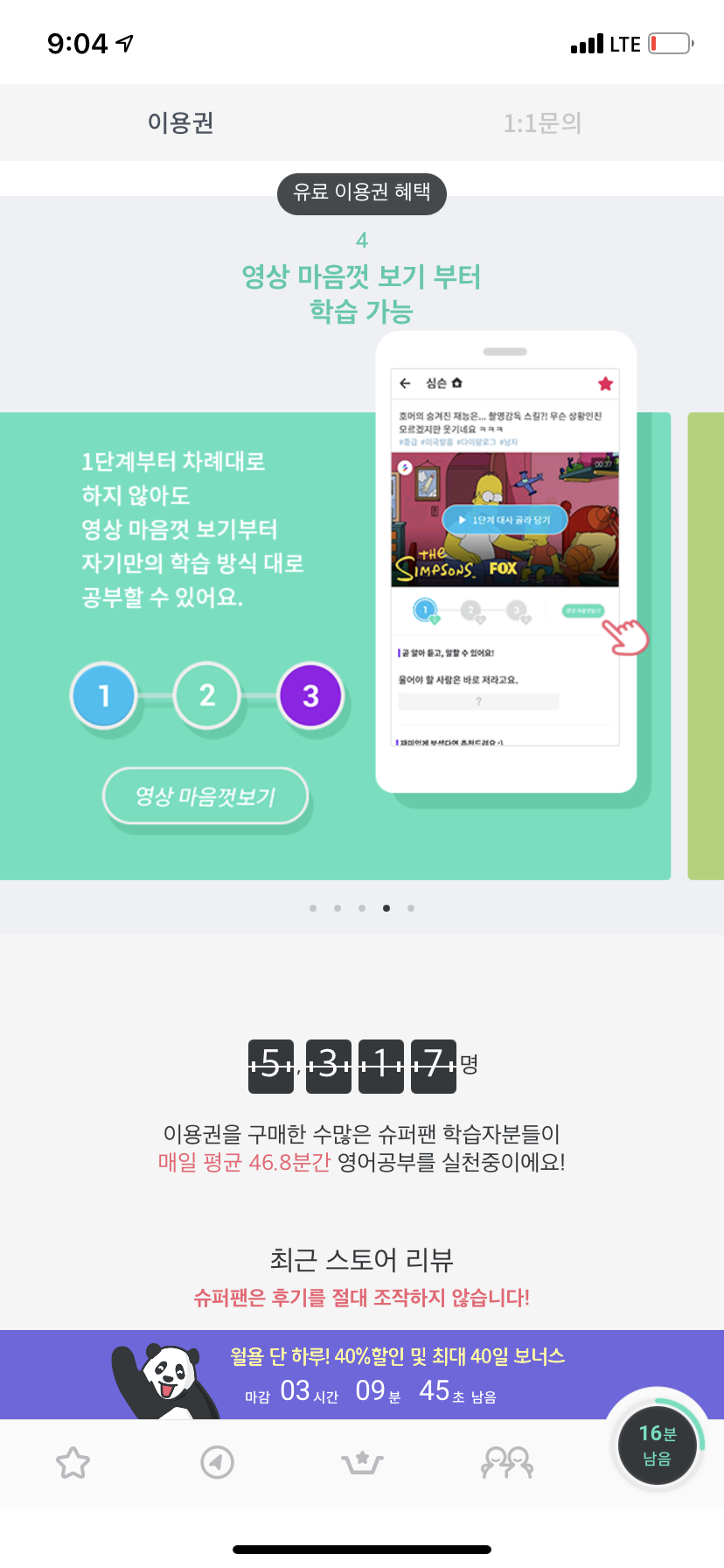 이유 : 여러 자료와 카테고리를 제시하여 관심있는 영상에서 흥미유발 및 영어공부 유도단, 유료 결제인 부분이 아쉽다.. (´;ω;`)