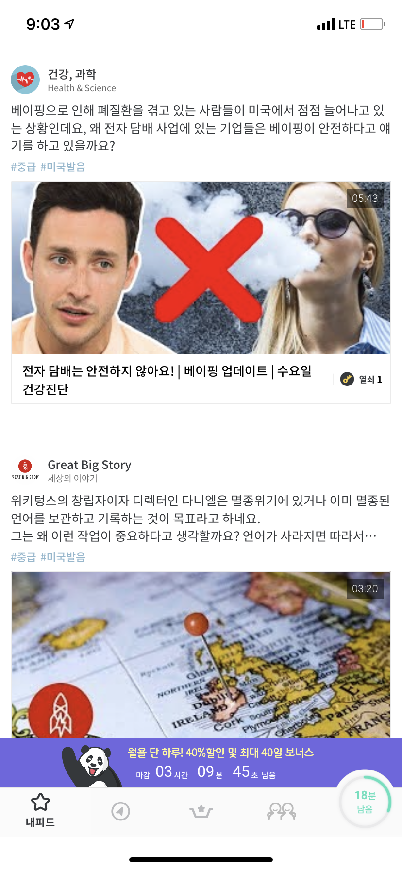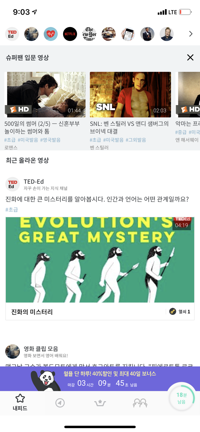 자신이 선택한 것들을 중심으로 영어와 관련된 도움이 되는 유머나 재밌는 영상을 자신만의 피드에 추천해주었습니다.