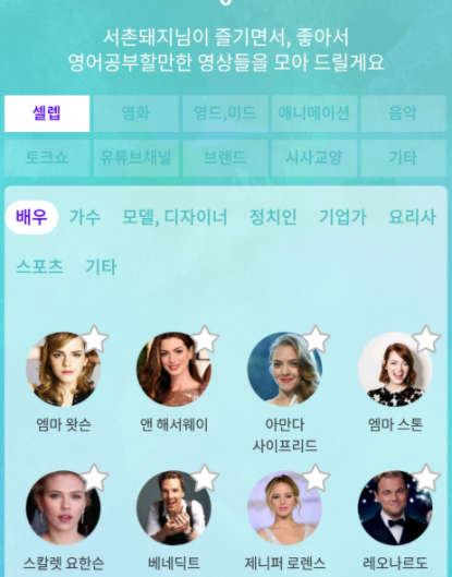 이 앱을 다운받아서 실행하면 카테고리가 많이 등장합니다저는 셀럽중 여배우를 중심으로 선택했고 다른 것은 미드필더 음악 및 유튜브 채널을 몇 가지 선택해 보았습니다.ㅇ