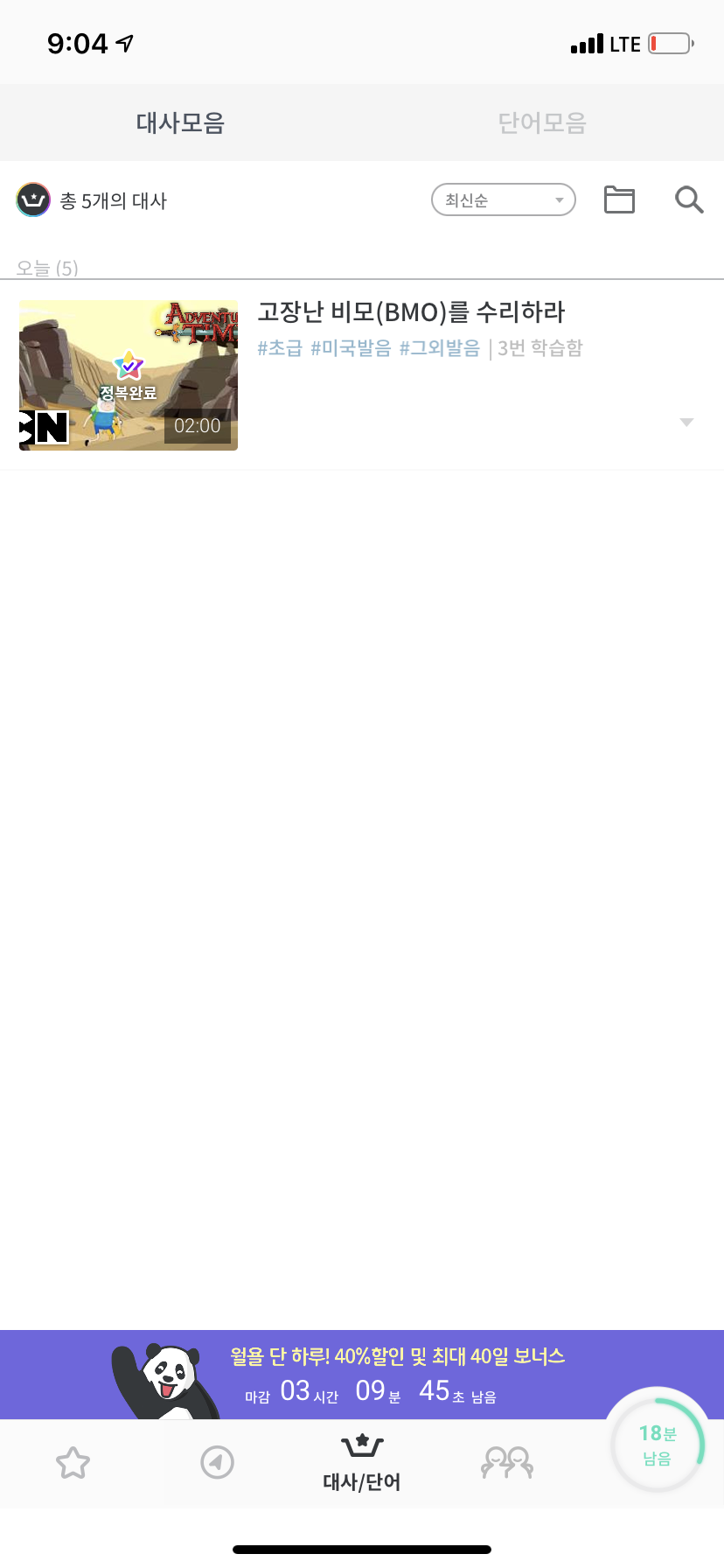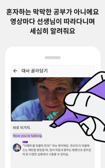 첫 번째는 영상을 먼저 보고 영상을 보면서 대사를 넣어 그 대사를 외우는 방식으로 구성된 학습방식 어플입니다!