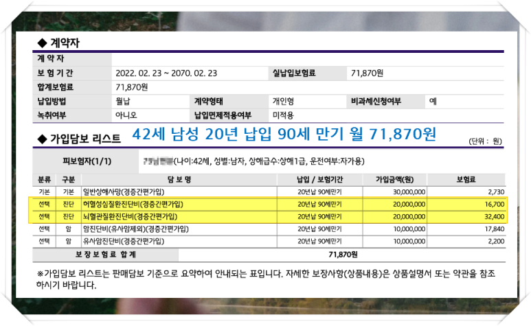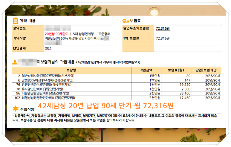 20년 납입하여 90세까지 보장되는 42세 남성 상해 급수 1급의 예입니다.뇌혈관질환 진단비와 허혈성심질환 진단비는 기존 뇌출혈, 뇌졸중, 급성심근경색증보다 조금 다양해진 코드가 있으니 약관을 확인하시기 바랍니다.각각 2천만원으로 설정하고 암에 대한 부분도 희망해 암 진단비(유사암 제외)와 유사암 진단비를 각각 1천만원씩 만들었습니다.이 정도의 간편 보험료는 어떻습니까?납입면제는 포함되지 않습니다.그럼 다른 회사의 제안서도 비교해 볼까요?