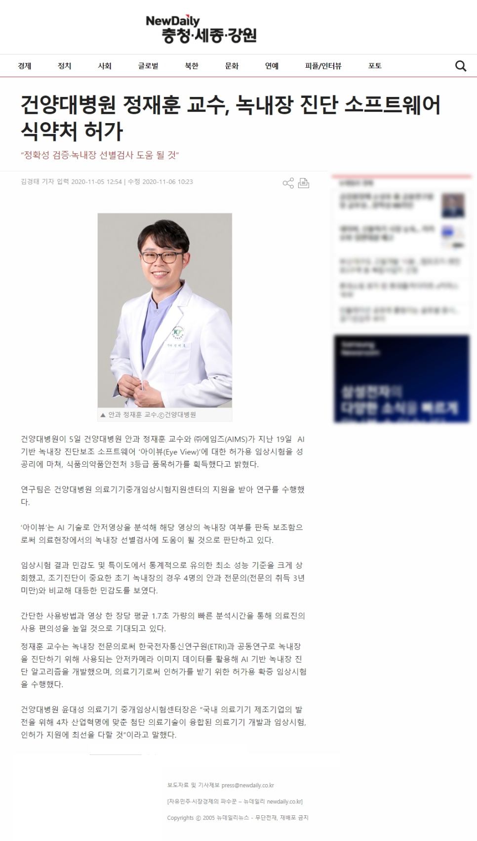http://cc.newdaily.co.kr/site/data/html/2020/11/05/2020110500123.html 건양대병원은 건양대병원 안과 정재훈 교수와 ㈜에임즈(AIMS)가 AI 기반의 녹내장 진단 보조 소프트웨어 ‘아이뷰(EyeView)’에 대한 허가용 임상시험을 성공적으로 마쳐 식품의약품안전처 3등급 품목 허가를 획득했다고 5일 밝혔다.연구팀은 건양대병원 의료기기 중개 임상시험 지원센터의 지원을 받아 연구를 진행했다.’아이뷰’는 AI기술로 안저영상을 분석하여 해당 영상의 녹내장 여부를… cc.newdaily.co.kr