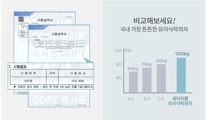 탈부착이 가능한 PP 소재 트레이는 위생적이고 깨끗한 세척이 가능하여 안심하고 사용하실 수 있습니다. 아직 식사 시간이 익숙하지 않아서 여기저기 흘려서 채워 먹는 우리 아이. 식후에 쉽고 빠르게 다듬을 수 있어 엄마들이 가장 많이 볼 수 있는 기능 중 하나로 꼽을 수 있습니다. 국내에서 가장 튼튼한 100kg 하중 테스트 통과
