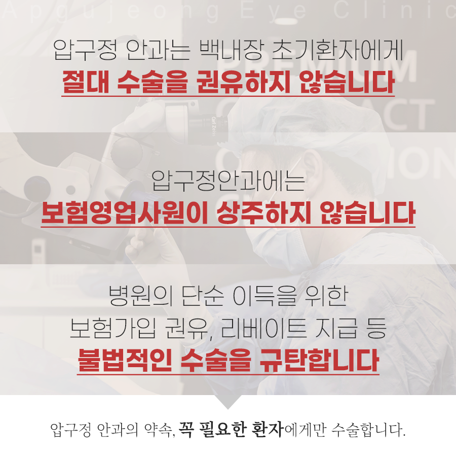 압구정안과의원은 백내장 수술 후 안경 없이 편리한 생활을 오래도록 누릴 수 있도록 평생 시력 보장 제도를 실시하고 관리도 지원하고 있습니다. 항상 정직한 진료만을 제공하고자 노력한 결과 여러 곳에서 특히 이 분야로 인정받고 있습니다. 그동안 백내장 수술 후 안경을 반드시 착용해야 한다는 인식으로 헤매셨다면 상담을 통해 확인하시기 바랍니다.