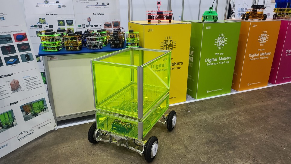 선문대학교 스마트자동차공학부는 선문대학교 대학혁신지원사업의 지원으로 국내 유일 해외로 수출하는 자율주행자동차 제작 교육과정 mobility Accelerator를 개발하고, 실제 교과과정에서 학생들이 직접 설계하고 제작하는 다양한 교육용 플랫폼을 전시하고 있습니다.