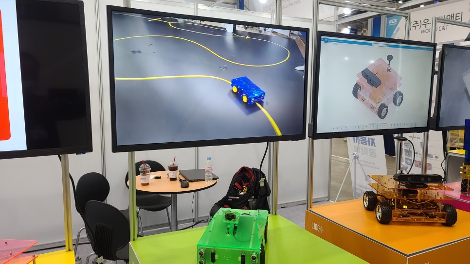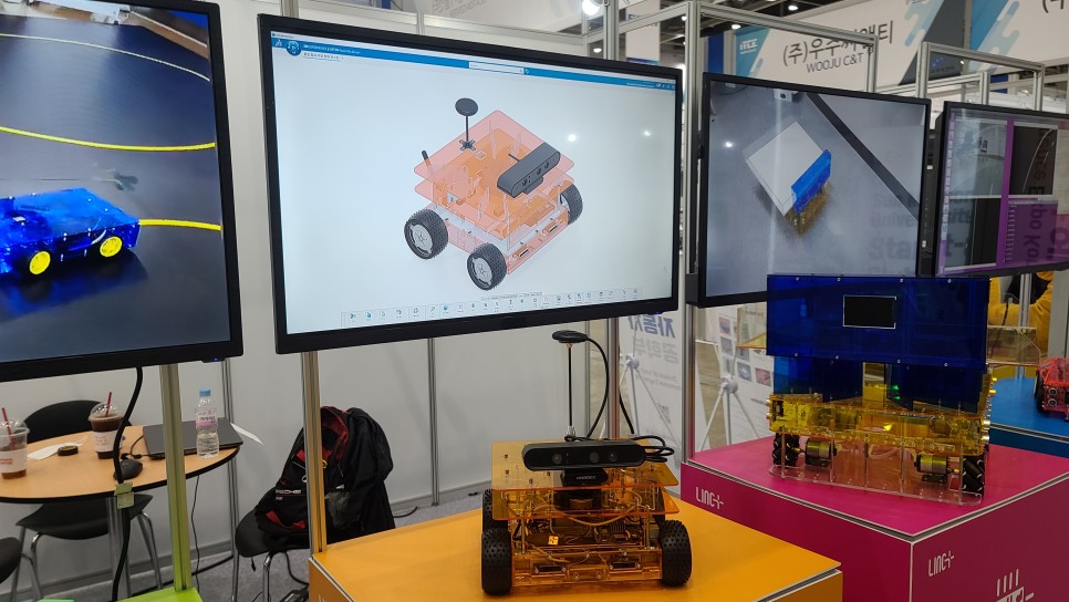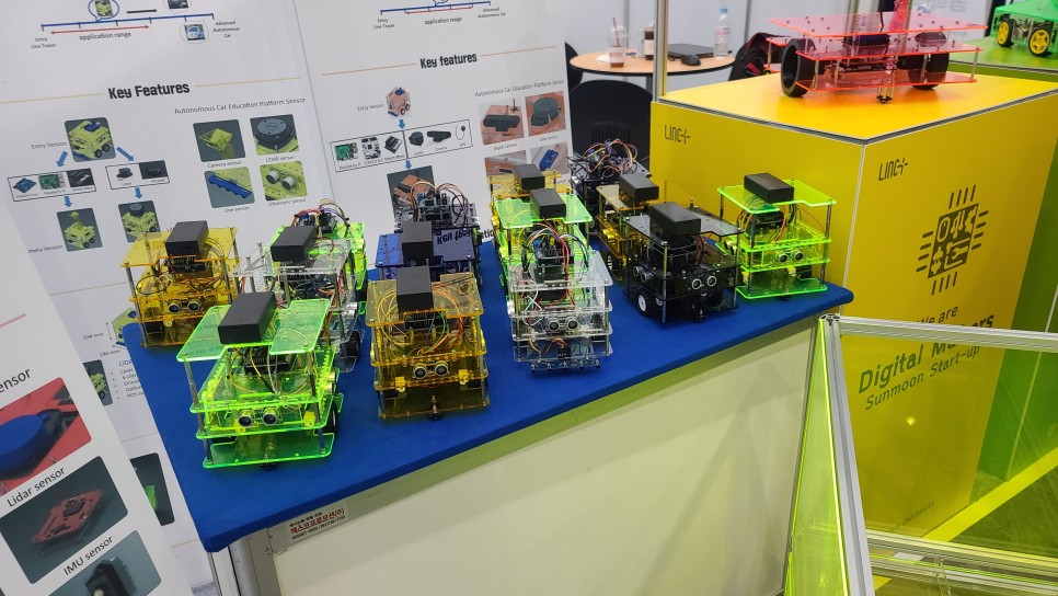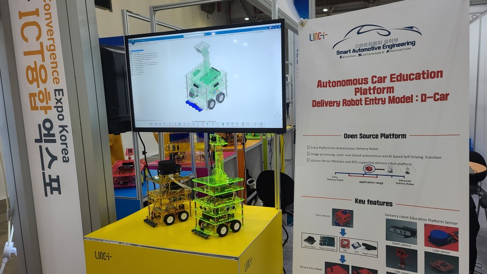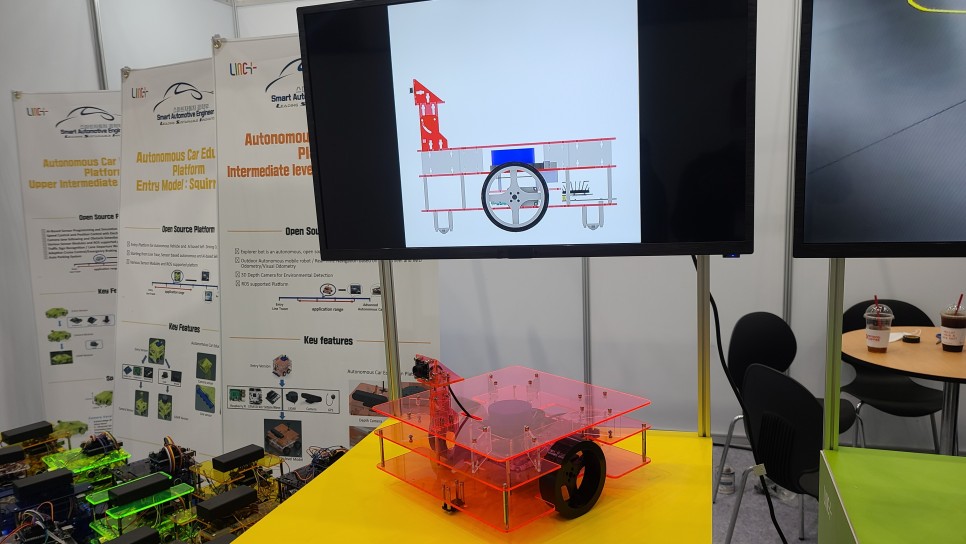 전시하고 있는 플랫폼은 수준별로 모듈로 구분되어 전 교육과정에 응용하고 있으며, 초중고 대학이 공동으로 사용하는 자율주행 자동차 로봇 리스 모듈과 1/10 크기의 자율주행 자동차 SAE-CAR, ROS(Robot Operating System) 기반의 배달 로봇 ‘백두와 한라’가 전시되어 있습니다.