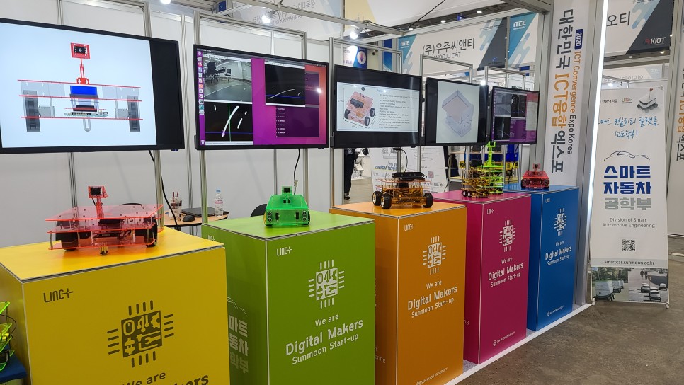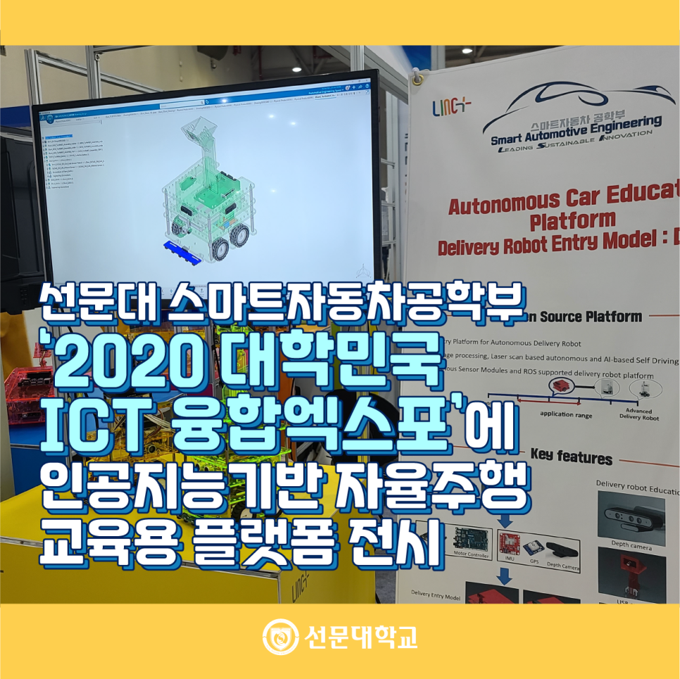 선문대학교 스마트자동차공학부(학부장 이지영 교수)는 인공지능 기반의 교육용 자율주행 플랫폼 6종을 전시했습니다.이번 전시회는 ICT(정보통신기술)와 연결시키는 4차 산업기술 기반의 다양한 플랫폼이 기업 중심으로 전시되었습니다.