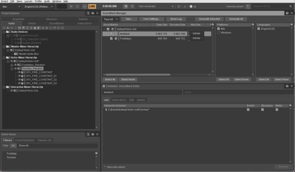 위의 프로그램은 Audio Kinetic이 개발한 미들웨어인 WWise이다.이 미들웨어들은 사운드 디자이너들이 복잡한 물건을 쉽게 제어할 수 있다.