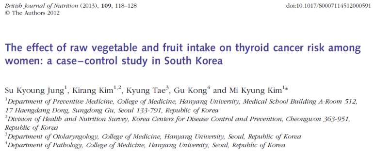 여성의 생야채 및 과실 섭취와 갑상선암 위험 사이의 효과; 한국의 케이스-대조군 연구, 2013