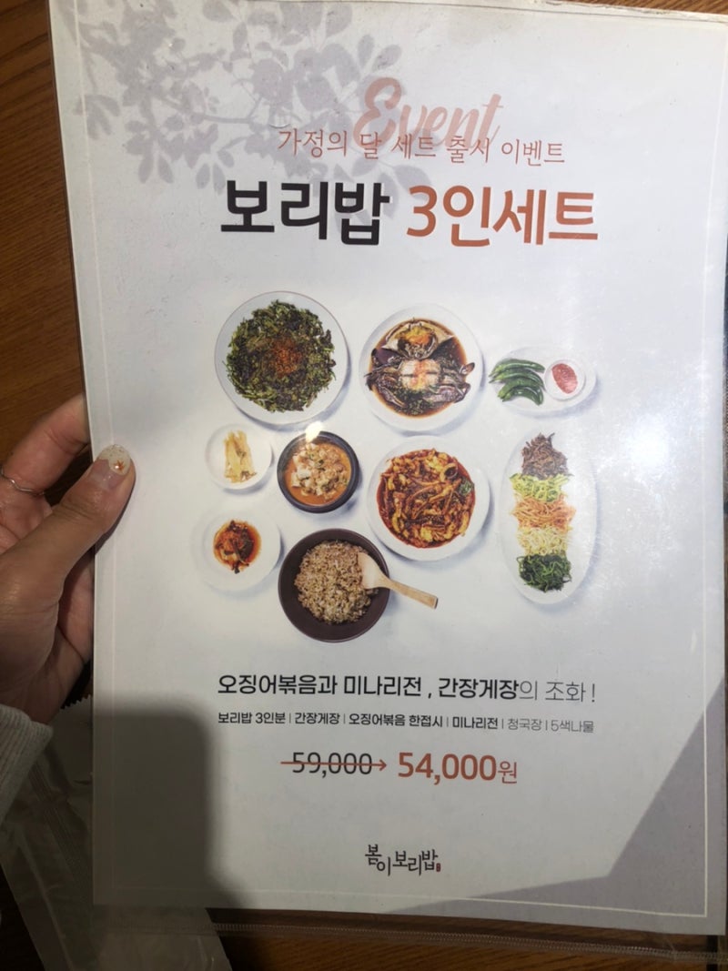 성인 4명 + 유아 1명 총 5명이고 4인 세트로 주문했는데 보리밥만 1회 리필해서 반찬의 양은 충분했습니다. – 봄 4인세트 78,000원 보리밥 4인 + 갈치구이 + 오징어볶음 + 간장갈비찜 + 미나리전 + 청국장 + 5색 나물 – 참고로 영종도 간장게장 맛집이라 3인세트 + 2인세트 조합도 많이 주문하셨는데 간장게장, 제육볶음, 꼬막무침까지 더 다양하게 드실 수 있어서 괜찮을 것 같아요!