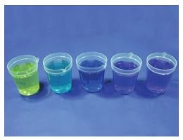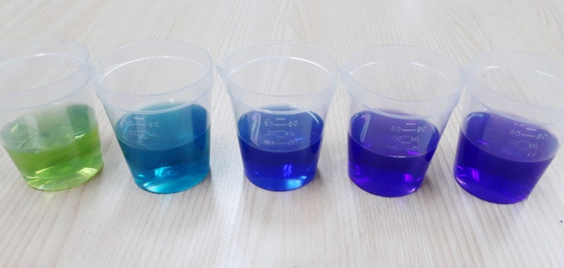 메틸바이올렛 용액을 농도를 달리한 염산 용액에 떨어뜨리면 연두색, 파랑색, 보라색으로 농도에 따라 색상이 달라집니다.