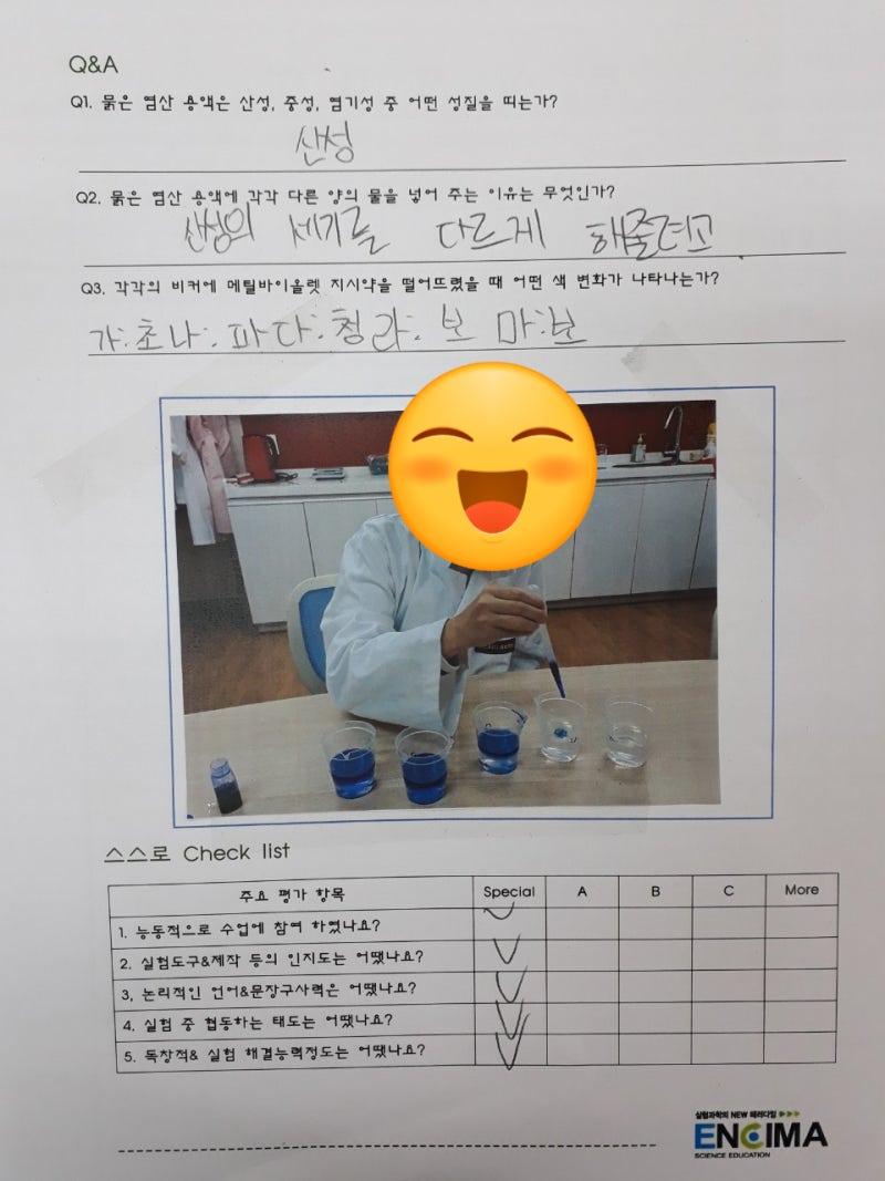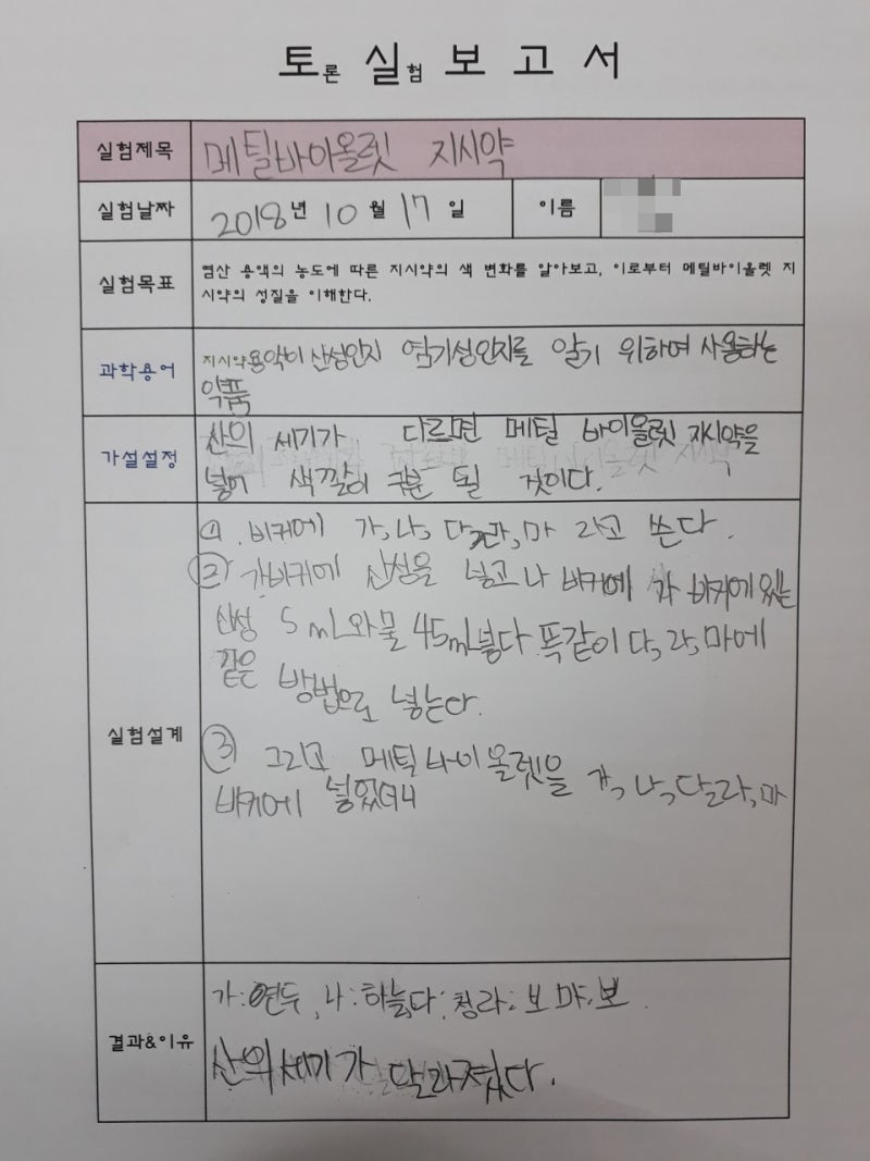이는 메틸바이올렛 지시제가 용액이 가진 산성의 세기에 따라 연두색, 파랑색, 보라색의 네 가지 색으로 변하는 성질이 있기 때문입니다.그리고 주의! 염산용액은 강산성으로 피부에 닿으면 위험하므로 반드시 보호장갑을 착용해야 합니다.실험 후에는 보고서를 쓰고(각자가 경험한 순서나 알게 된 내용을 스스로 생각하고 작성하기 때문에 모든 친구들의 보고서 표현이 다릅니다.)