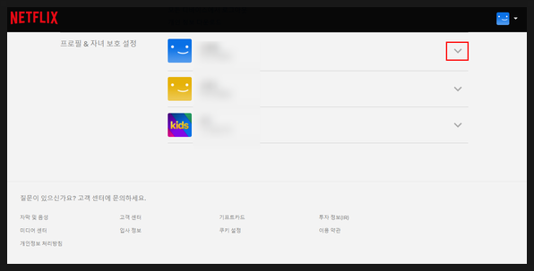 스크롤을 다운로드하면 계정을 공유하고 있는 프로필 내역을 볼 수 있습니다.여기서 화질을 설정하고 싶은 프로필 오른쪽에 있는 아래 화살표를 클릭합니다.