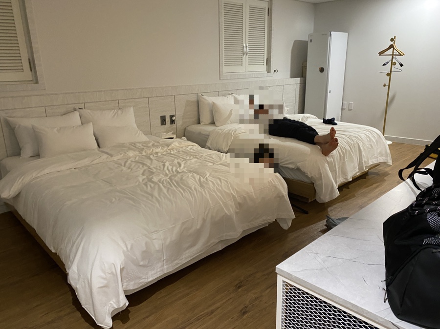 예약할 때 바쁘게 예약을 해서 무슨 방인지도 기억이 안 나고.그냥 세 식구가 편하게 자려고 침대가 두 개 있는 방으로 한 건 기억해.아, 그랬구나.라고 아이 1명 추가요금을 받았으므로… 결제하고 카드키를 받고 올라갔는데…하…