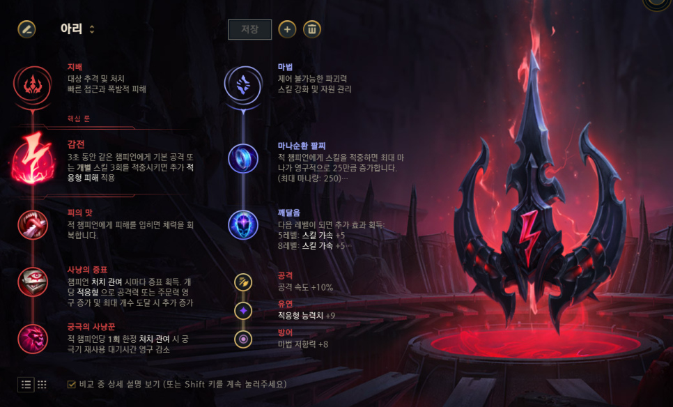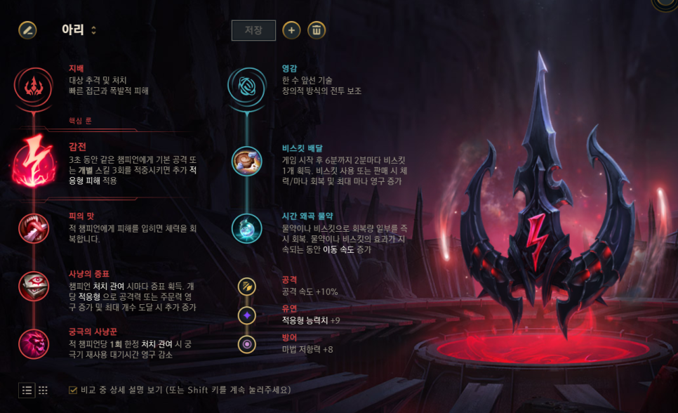 지배에 감전, 피의 맛, 사냥증, 궁사를 들고 영감에는 비스킷, 시 왜곡이 있습니다.감전은 개미의 부족한 딜링 능력을 충족시켜주는 필수 룬으로 궁궐 사냥꾼과 쿨감 아이템을 통해 중반이 지나면 궁궐을 50초 안에 계속 사용할 수 있습니다.
