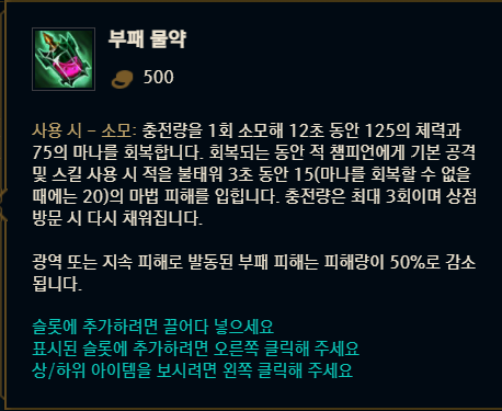비스킷, 시 왜곡을 들었기 때문에 시작 아이템은 무조건 부패한 물약 고정입니다.상대의 견제가 강해도 비스킷과 부패물 약물의 흡혈로 안정적인 라인전을 할 수 있습니다.