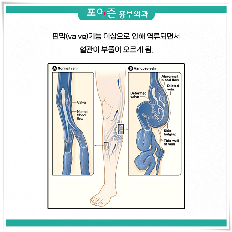 역류한 혈액에 의해 혈관의 압력은 그만큼 높아지고 그로 인해 혈관은 이전보다 심하게 피부 밖으로 돌출하는 조건이 성립됩니다.