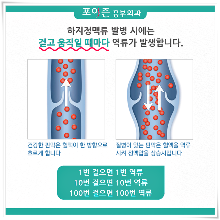 이미지 오른쪽을 보면 하지정맥류 환자의 혈액은 환자가 다리를 움직일 때마다 역류가 지속해서 발생할 수 있는 조건임을 알 수 있습니다.