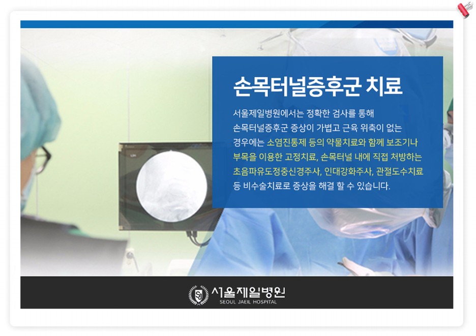 본원에서는 손목터널증후군을 개선할 수 있도록 다양한 비수술적 치료를 실시하고 있습니다. 손목터널증후군의 증상이 가벼움과 근육 위축이 없는 경우에는 소염진통제 등의 약물치료와 함께 보조기나 부목을 이용한 고정치료, 손목터널 내에 직접 처방하는 초음파 유도 정중신경주사, 인대강화주사, 관절도수치료 등 다양한 비수술적 치료를 통해 손목터널증후군을 개선할 수 있도록 도와드리오니 편안하게 내원해 주시기 바랍니다.